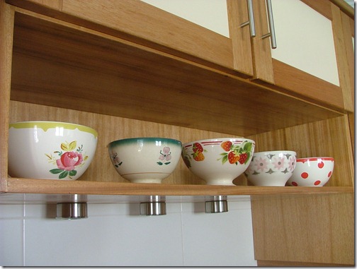 One space I planned for and therefore was easy to decorate was my latte bowl shelf. Just enough room for them and the hidden electrical cords behind them for some light on my desk!